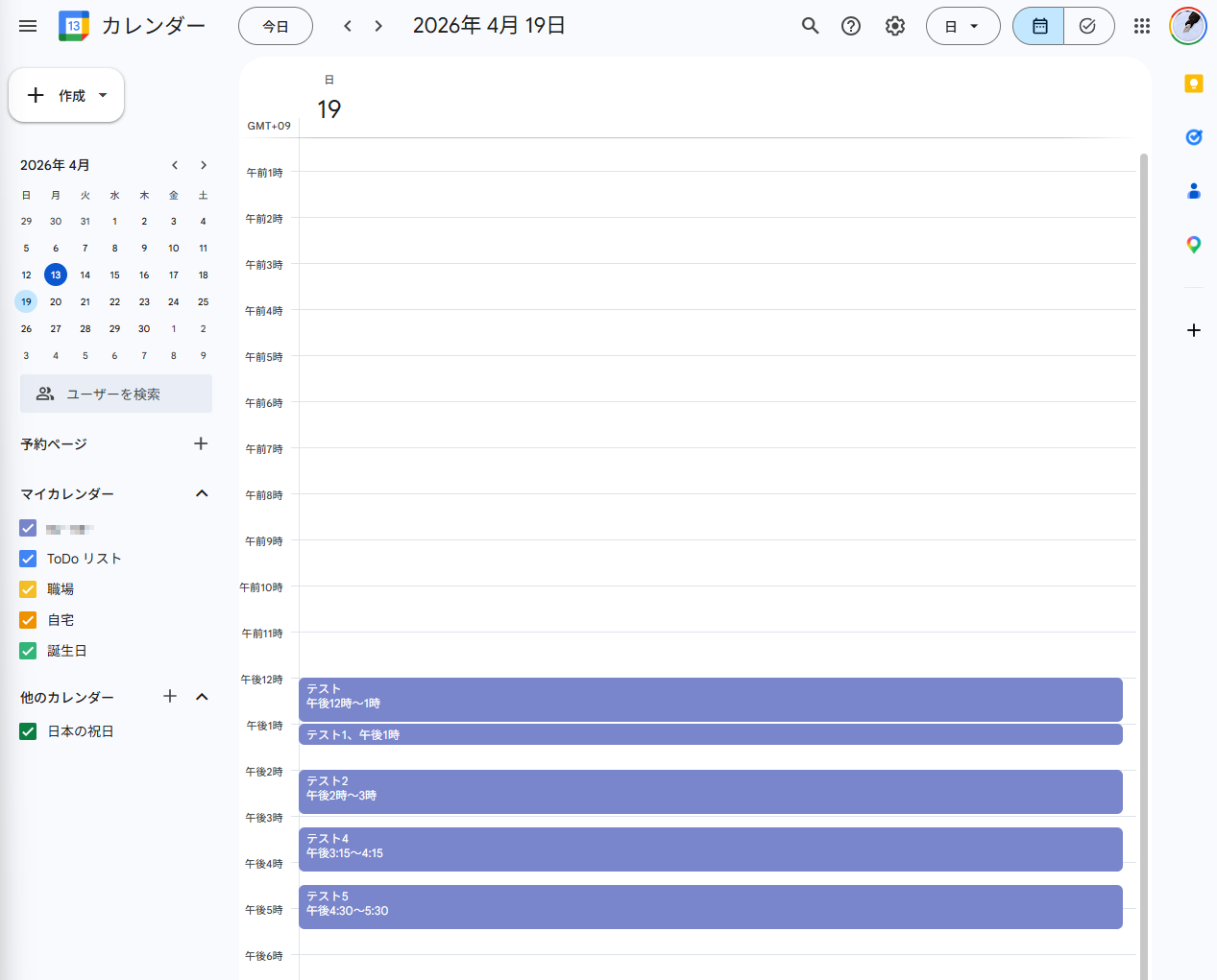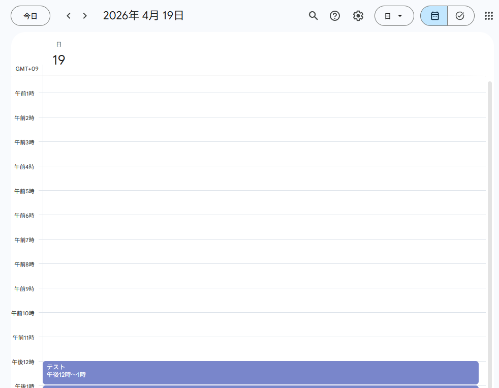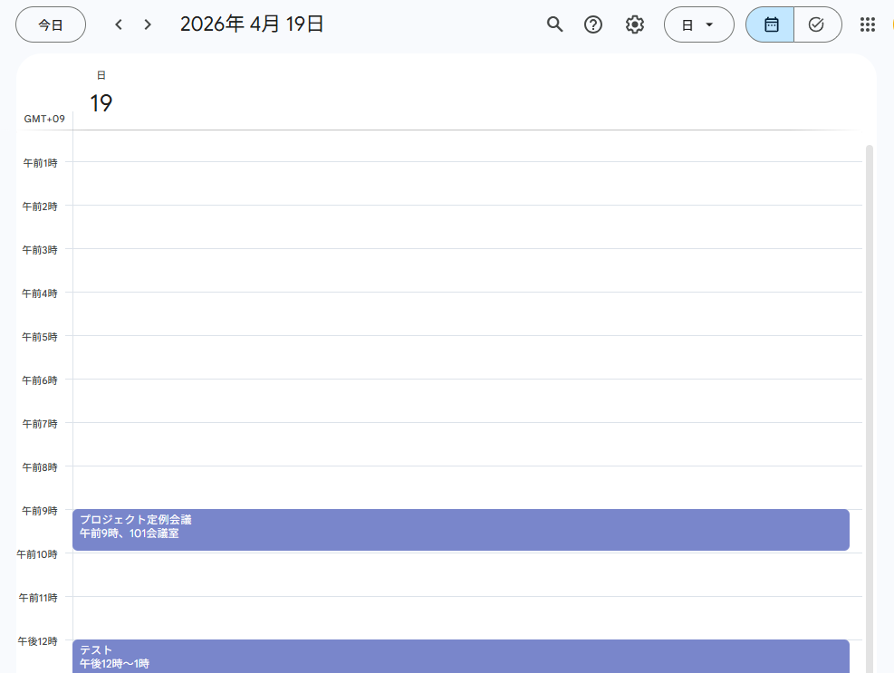 検証1:スケジュールの確認 まずは、指定した日付の予定を検索し、空き時間を確認する操作を検証しました。まずは、以下のように架空の予定を作成しました。
