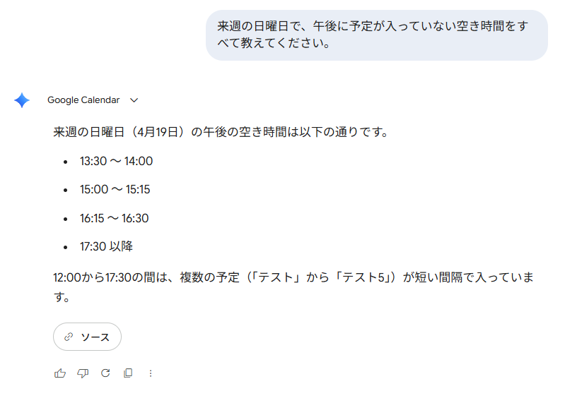 予定を読み取る精度が高い 30分以上のまとまった空き時間を提案する気が利く処理ができる 「@」コマンド(GeminiのGoogleアプリを参照する機能)を使わなくてもカレンダーを参照できる Geminiにスケジュールの確認を依頼したところ、登録されている予定を正確に読み取り、予定が重複することなく空き時間を提示してくれました。 その処理精度の高さから、複雑な予定の管理にも十分に活用できることがわかります。特に優れていると感じたのは、単に空き時間を羅列するだけでなく、最後に「30分以上の空き時間」がある箇所を一文で提案してくれた点です。こうしたAIならではの気が利く処理は、実際のスケジュール調整において非常に役立ちます。