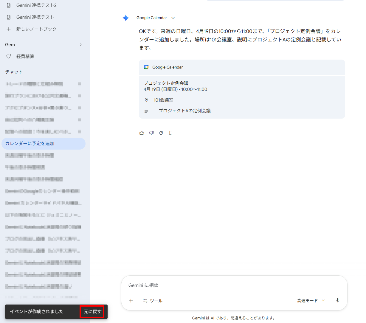 予定の作成、時間の変更、キャンセルの指示を正確に処理できた 作成やキャンセル時に「元に戻す」が表示され、誤操作を取り消せる キャンセルの指示では確認の返答があり、誤った削除を防ぎやすい Gemini上で新しく会議の予定を作成したり、登録済みの時間を変更・キャンセルしたりする操作を試した結果、すべての指示が正確に処理されました。チャット上で操作が完結するため、わざわざカレンダーを開く手間が省けます。