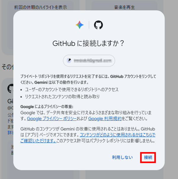 連携の設定手順 まずは、GeminiとGitHubを連携する手順です。この作業は初回のみ必要になります。