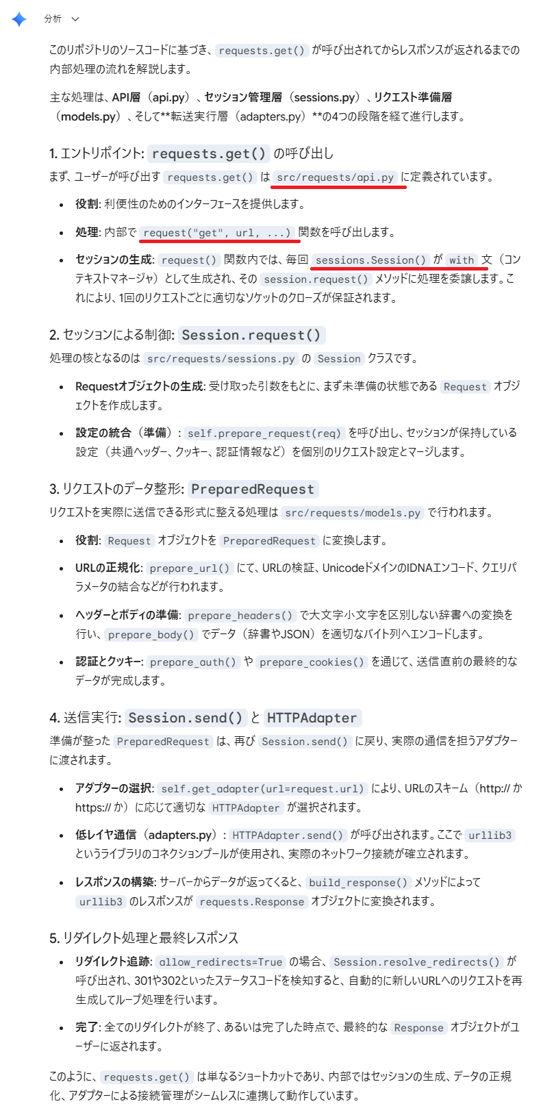 リポジトリの構成や各ファイル内のコードを高精度で解釈できる 複数ファイルにまたがる複雑な処理フローでも素早く実行経路を把握できる URLを指定してインポートするだけでプロジェクト全体を理解したアシスタントになる 実際に検証を行った結果、GeminiとGitHubを連携させることで、開発効率が向上することが実証されました。特に恩恵を感じたのは、複数ファイルにまたがる複雑なコードの解読です。たとえば、1つのメソッドの実行に「api.py」や「sessions.py」など複数のファイルが関与している場合、手作業で処理を追跡するには膨大な時間がかかります。しかし、Geminiを活用すれば全体の実行フローを素早く的確に把握できます。 さらに、ローカル環境へのクローンが不要になる点も大きなメリットです。 ブラウザ上で対象リポジトリのURLを指定するだけで、プロジェクトのコンテキストを深く理解した優秀なアシスタントがすぐに誕生します。仕様理解やデバッグにかかる時間を短縮できるため、現場のエンジニアにとってGeminiとGitHubの連携は、手放せないサポートツールになるはずです。