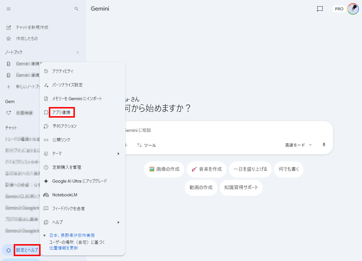 1.Geminiアプリの「設定とヘルプ」から「アプリ連携」を開く
