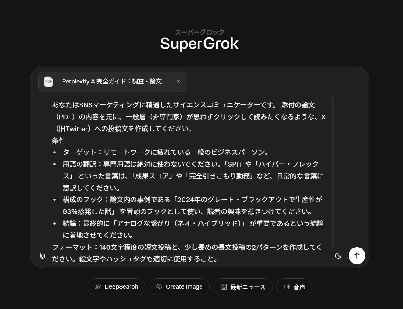 そこで今回は、Grokに「難解な論文を噛み砕いて発信する」役割を与えてみます。