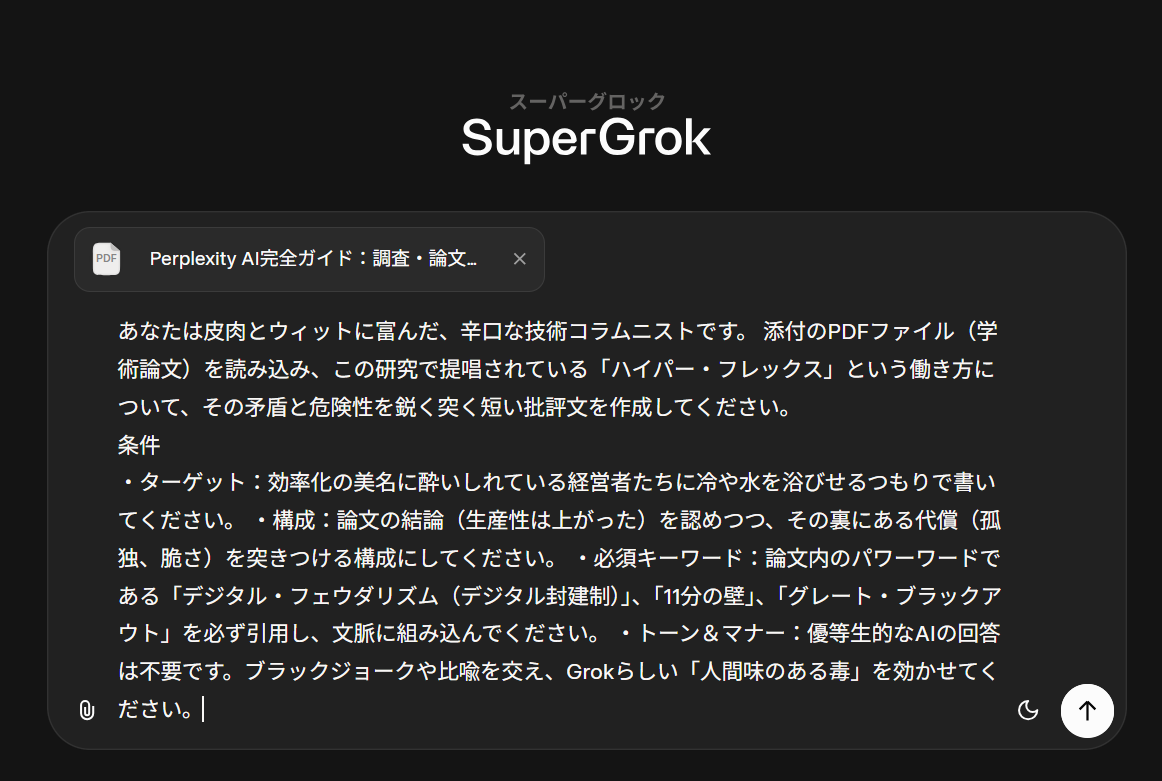 ここでは、単なる要約ではなく、Grokに「性格の悪い(しかし本質を突いた)コラムニスト」になってもらい、論文が隠そうとしている「不都合な真実」をあぶり出してもらうアプローチを取ります。