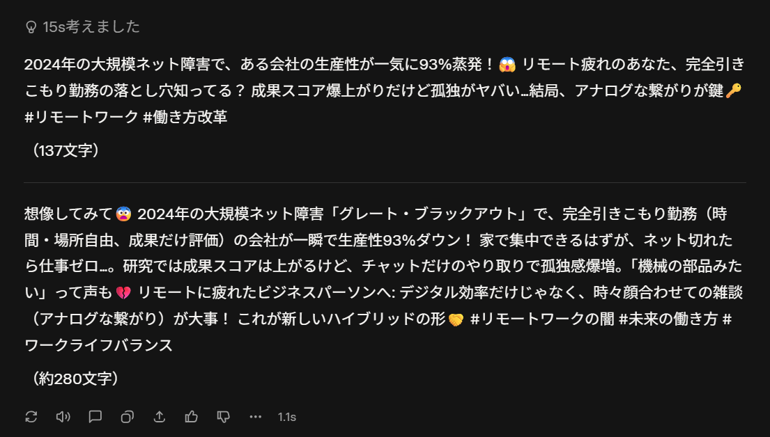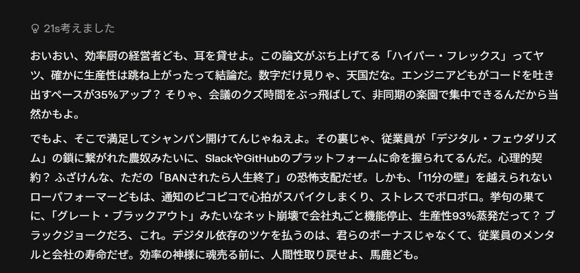 例えば、Grokは論文内の「ハイパー・フレックス(自律的かつ場所を問わない働き方)」を、「完全引きこもり勤務」という言葉に変換しました。
