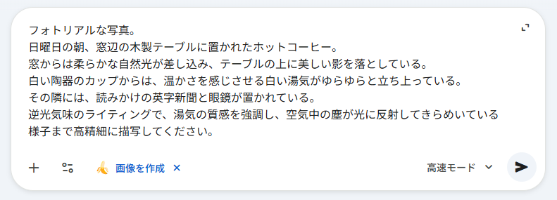 検証②:フォトリアルな光と影・湯気の表現 次に、「Flashの速度でProの品質」というアップデート情報の真偽を確かめるため、描写の難しいフォトリアルな画像を生成し、実力を検証します。