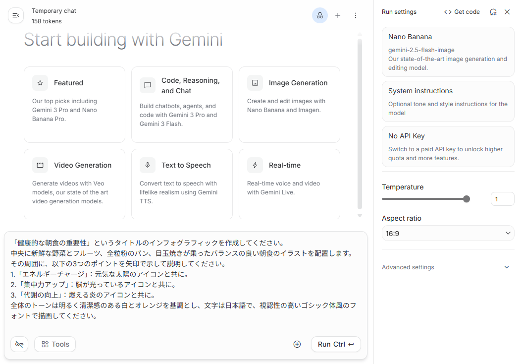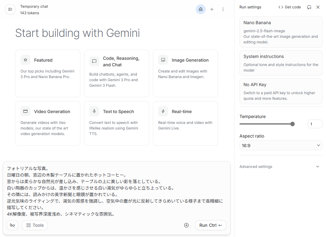 ここからは、実際にGeminiアプリを使ってNano Banana 2の実力を検証していきます。 比較対象として、旧モデルのNano BananaをGoogle AI Studioを使用し、同じプロンプトでどのような違いが出るかを確認します。