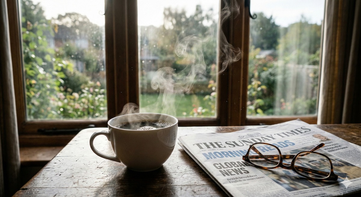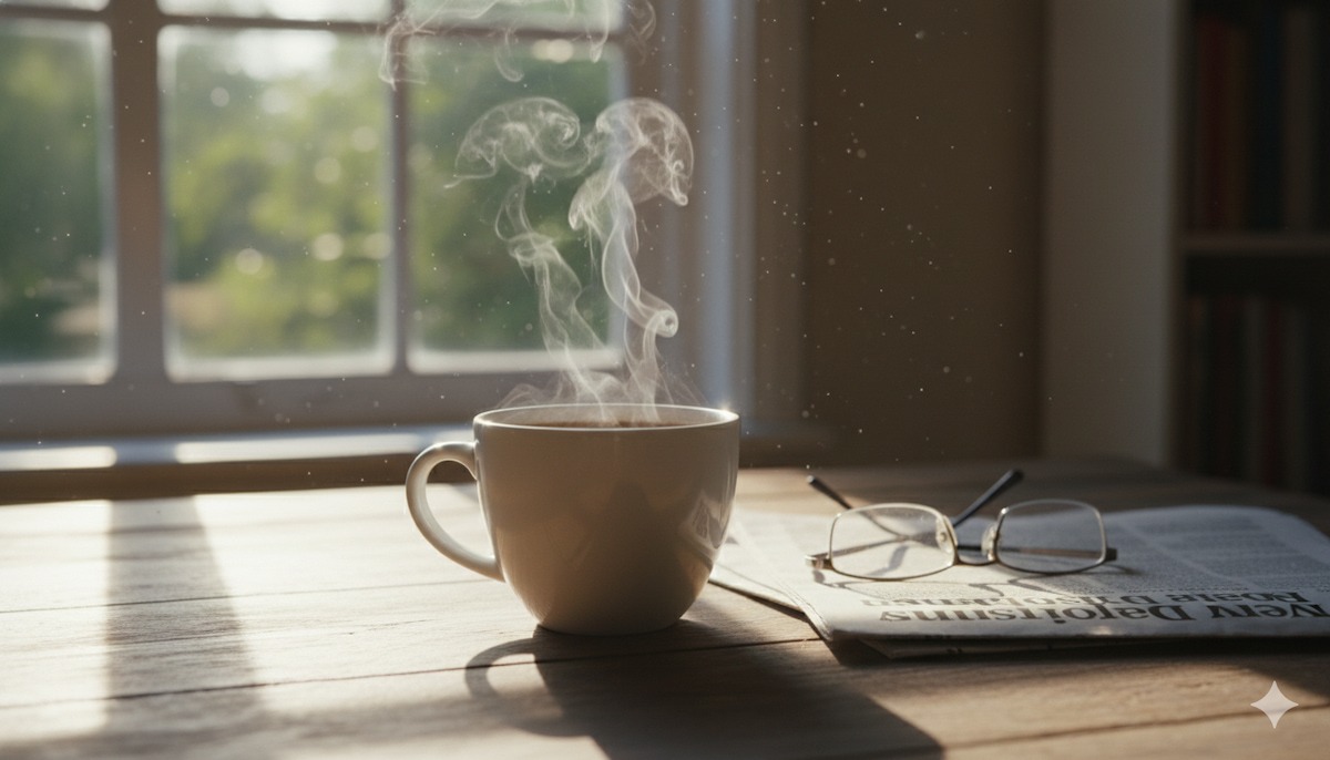 フォトリアルな写真。 日曜日の朝、窓辺の木製テーブルに置かれたホットコーヒー。 窓からは柔らかな自然光が差し込み、テーブルの上に美しい影を落としている。 白い陶器のカップからは、温かさを感じさせる白い湯気がゆらゆらと立ち上っている。 その隣には、読みかけの英字新聞と眼鏡が置かれている。 逆光気味のライティングで、湯気の質感を強調し、空気中の塵が光に反射してきらめいている様子まで高精細に描写してください。 4K解像度、被写界深度浅め、シネマティックな雰囲気。 ※Nano Banana 2で4K出力を利用するには、Google AI StudioのAPI経由での設定や、Geminiアプリの特定の有料プランが必要になる場合があります。