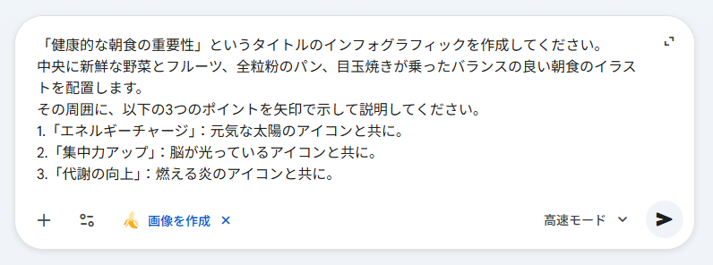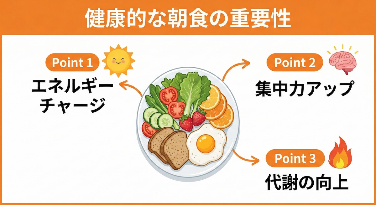 「健康的な朝食の重要性」というタイトルのインフォグラフィックを作成してください。 中央に新鮮な野菜とフルーツ、全粒粉のパン、目玉焼きが乗ったバランスの良い朝食のイラストを配置します。 その周囲に、以下の3つのポイントを矢印で示して説明してください。 1.「エネルギーチャージ」:元気な太陽のアイコンと共に。 2.「集中力アップ」:脳が光っているアイコンと共に。 3.「代謝の向上」:燃える炎のアイコンと共に。 全体のトーンは明るく清潔感のある白とオレンジを基調とし、文字は日本語で、視認性の高いゴシック体風のフォントで描画してください。 【Nano Banana 2】