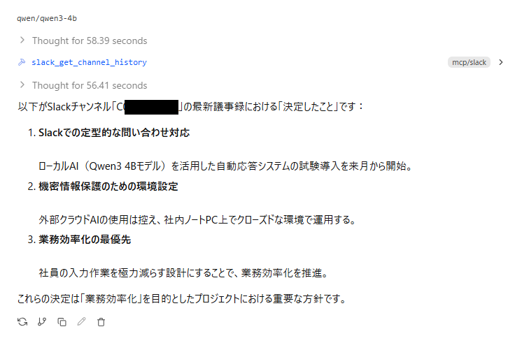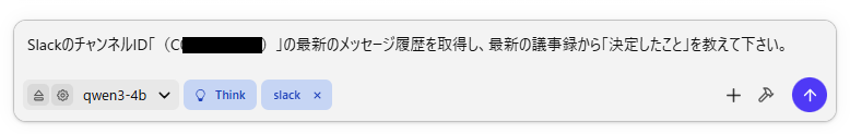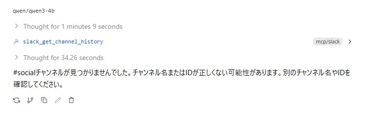 思考プロセスから原因を調べると、今回はQwenの軽量モデルのため、プロンプト内のチャンネル名からチャンネルIDを検索し、メッセージを取得して内容を要約するというタスクはハードルが高く、実行できないことがわかりました。
