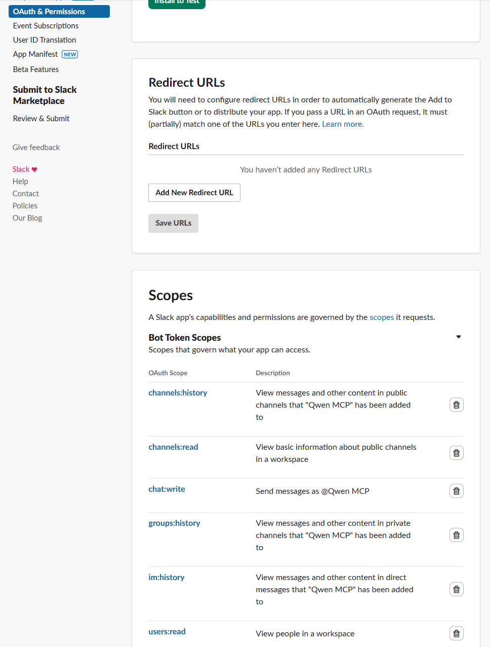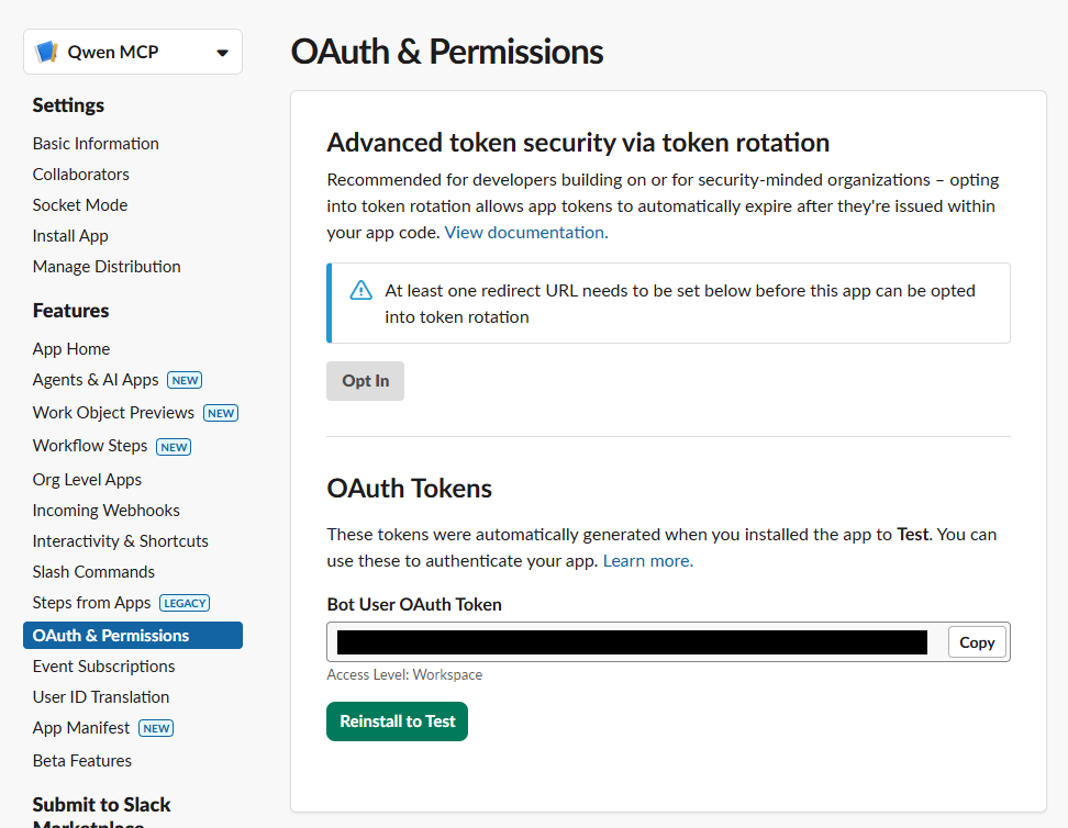 アプリを作成したら、「OAuth & Permissions」を開き、「Scopes」に以下の項目を設定して、「Install to (ワークスペース名)」をクリックします。