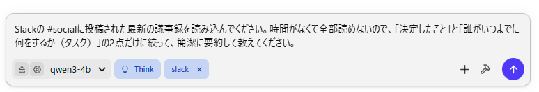設定が完了したら、いよいよQwenにSlackの分析を依頼してみましょう。