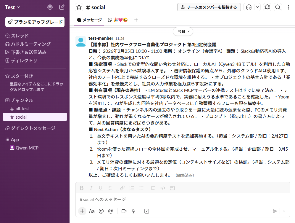 本記事では、LM StudioでQwenを使用して、プログラミング不要でSlack連携を実現する方法をご紹介しました。