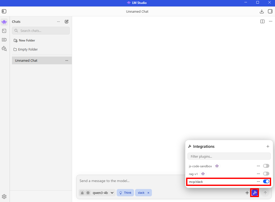 それでは、LM Studioでチャットを開き、「Qwen3-4B」モデルを選択後、設定したMCPのトグルをオンにします。