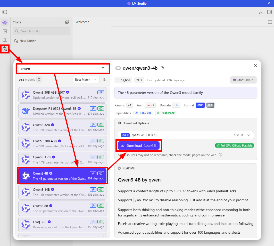 今回は、検証するPCのスペック上、軽量の「Qwen3-4B」モデルを使用します。
