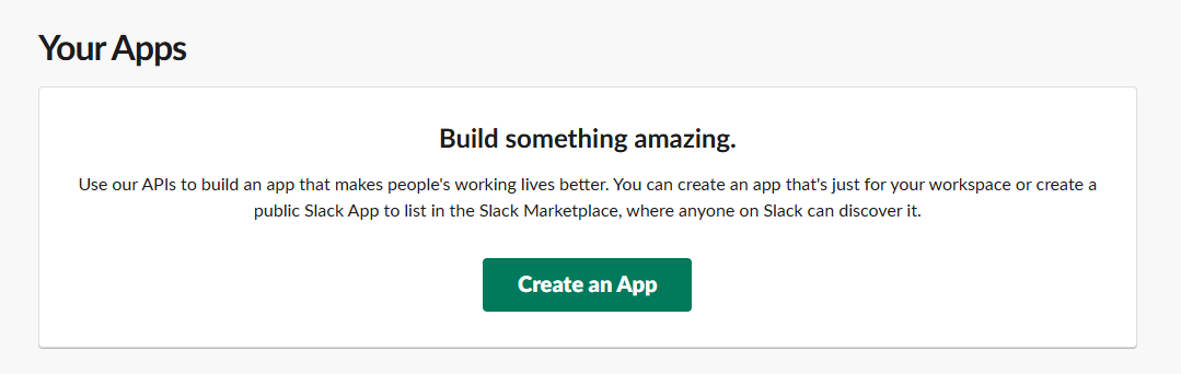 Slack APIダッシュボードにアクセスし、「Create an App」を選択してください。