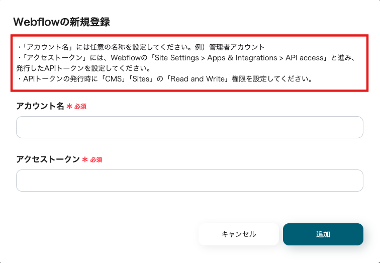 以下の画面が表示されたら、説明を確認し、「アカウント名」と「アクセストークン」を入力し、追加をクリックします。