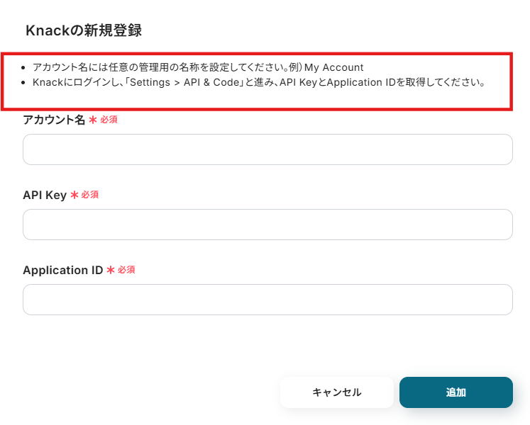 こちらも赤枠の説明を確認し、必須項目を入力し、「追加」をクリックします。