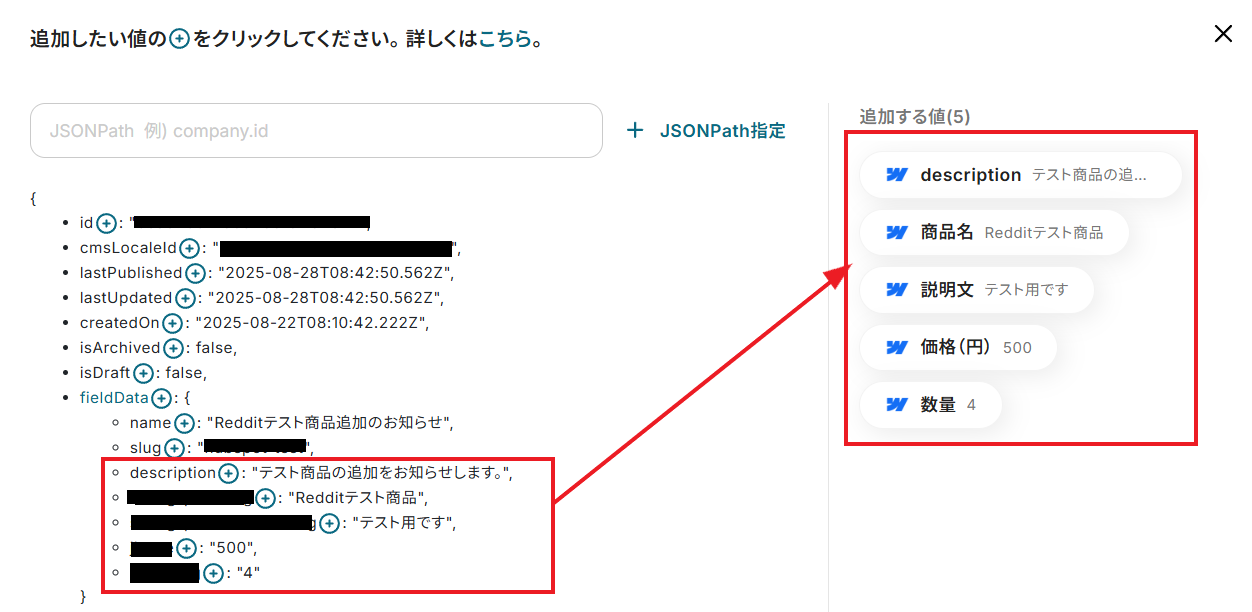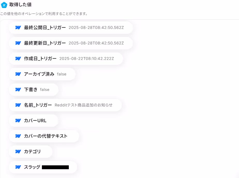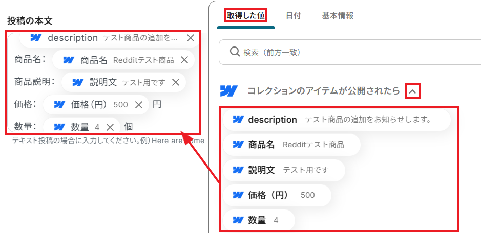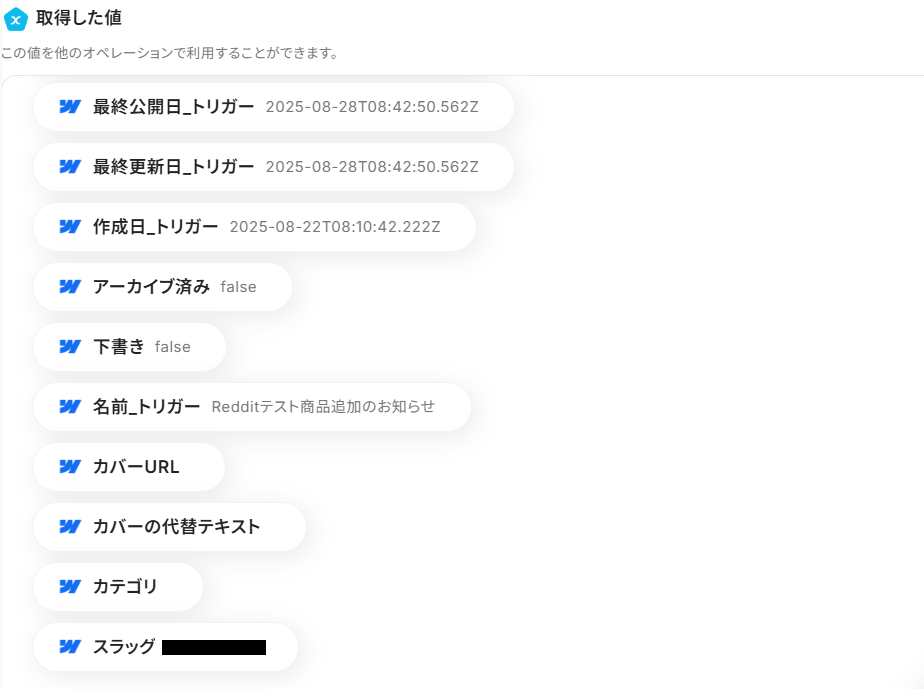 「取得した値」として、Webflowに公開したアイテムの情報が反映されていれば成功です。