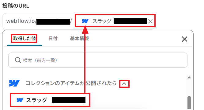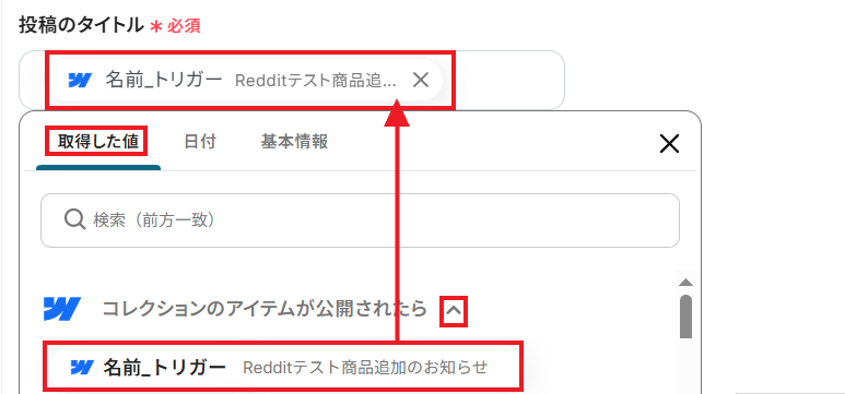 次に「投稿のタイトル」は、Webflowから取得したアウトプットを設定しましょう。