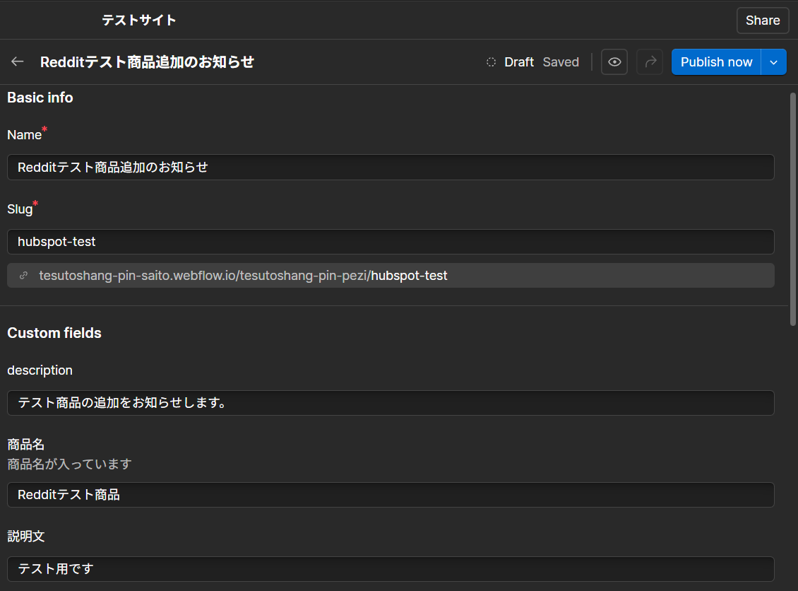 ここで一度Webflowの該当サイトにログインし、Yoomで設定したコレクション内にテスト用のアイテムを追加・公開しておきましょう。