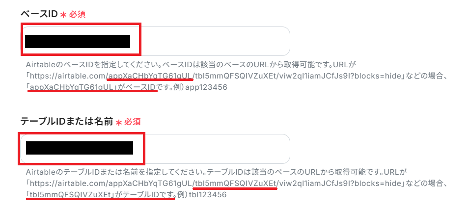 「ベースID」と「テーブルID」には、Airtableで更新したいデータベースに直接アクセスし、URLから抽出した文字列を入力します。