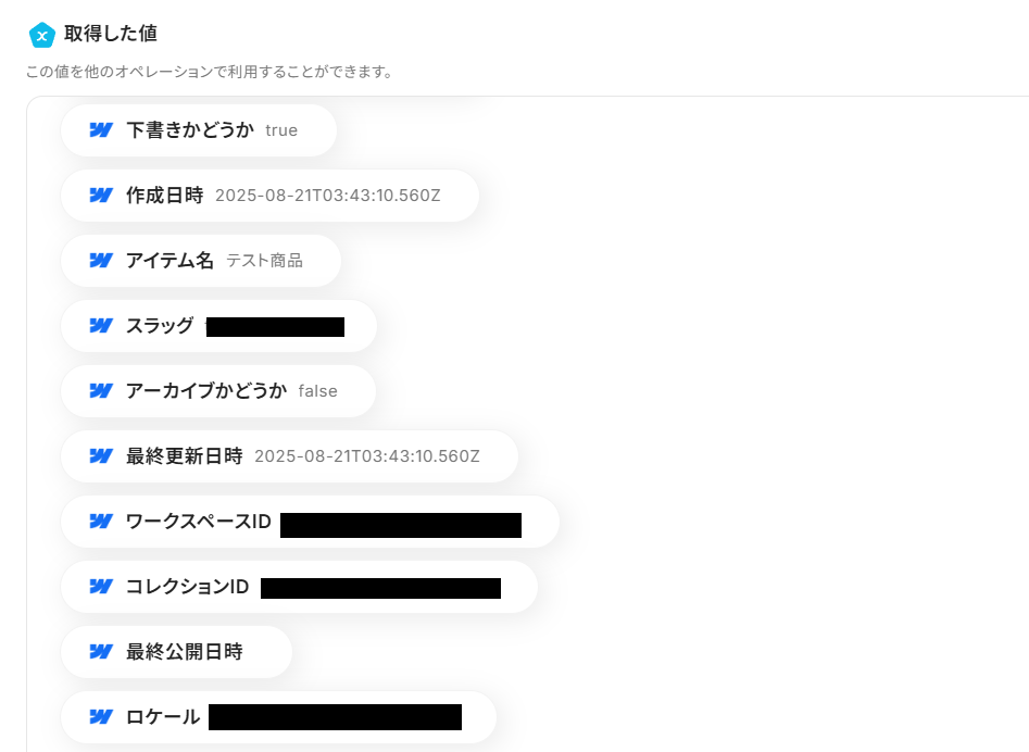 「取得した値」として、以下のようにWebflowに作成したテストの内容が反映されていれば成功です!