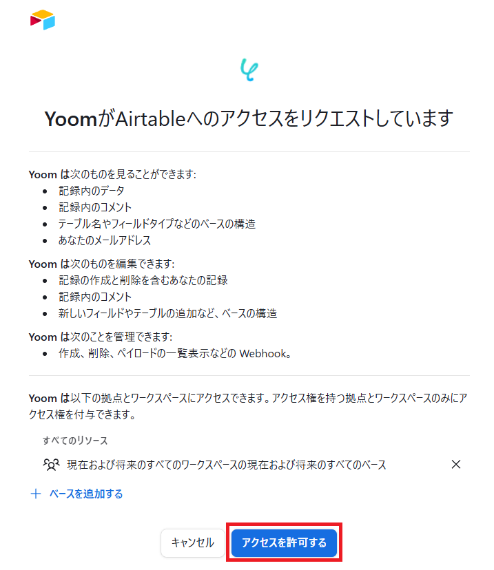 任意のAirtableでログインすると、YoomがAirtableにアクセス権限を求める画面が表示されます。「アクセスを許可する」をクリックしましょう。