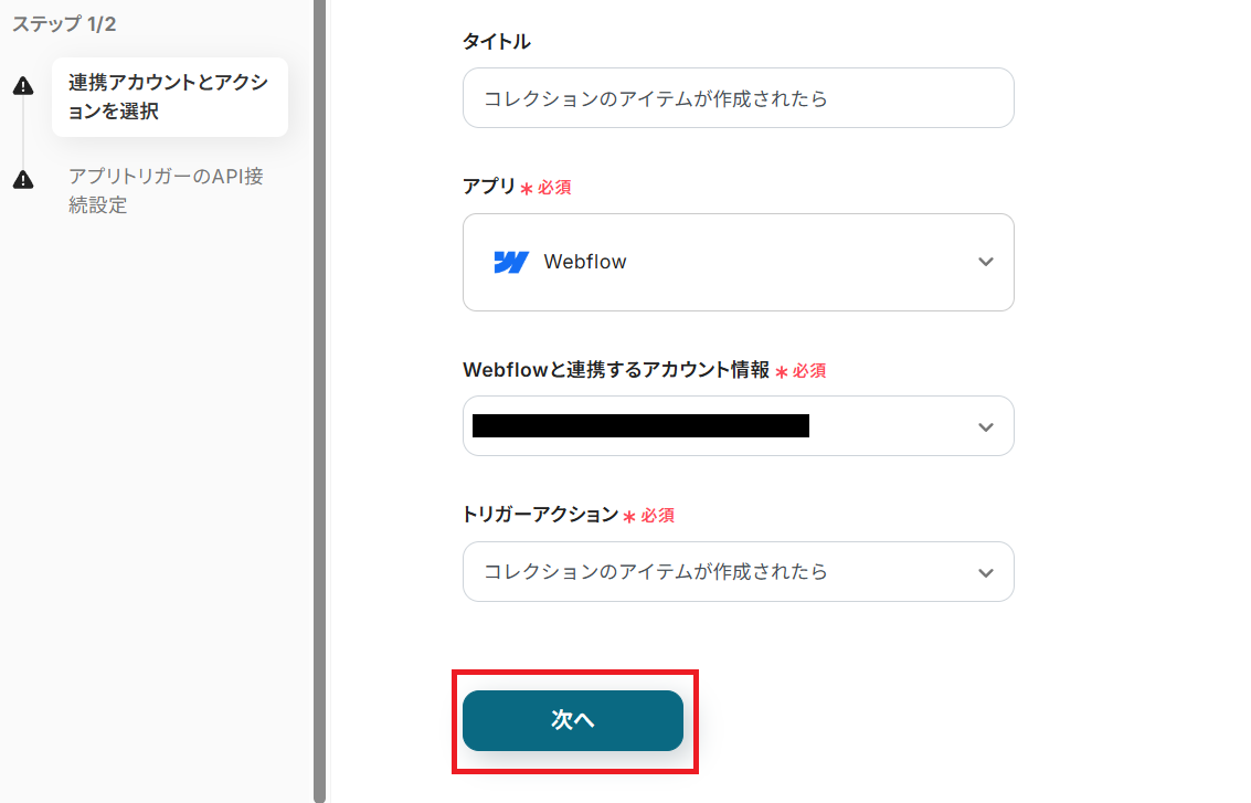 タイトルを任意で設定し、Webflowと連携するアカウントやアクション内容を確認したら「次へ」を押してください。