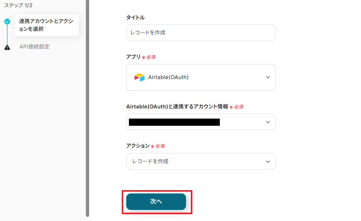 タイトルを任意で設定し、Airtableと連携するアカウントやアクション内容を確認したら「次へ」を押してください。