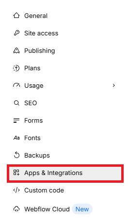 Webflowにログインし、Site Settings から「Apps & Integrations」 を選択してください。