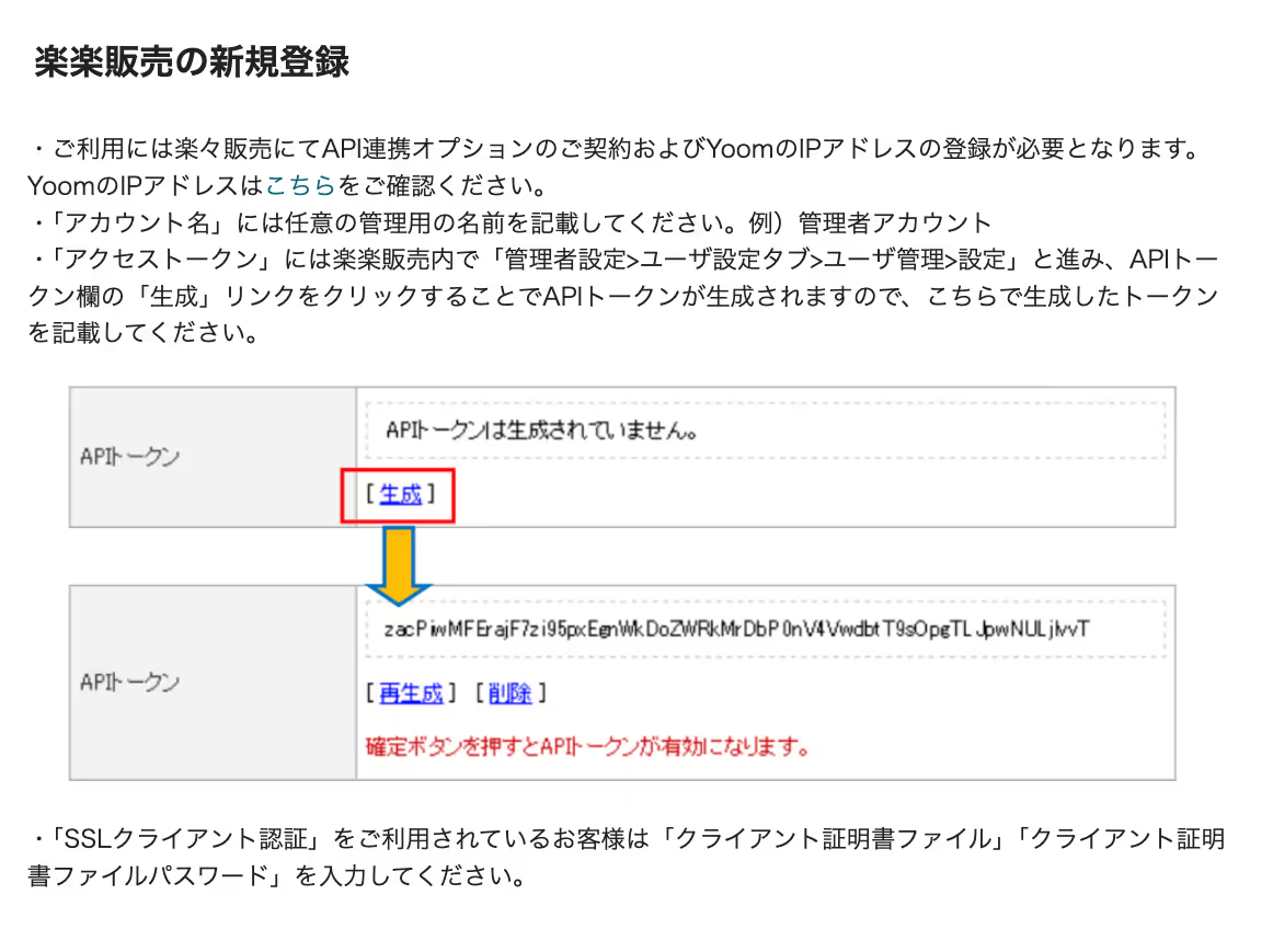 楽楽販売の新規登録画面が表示されるので、下図に記載されている内容に従ってAPIトークンを生成しましょう。