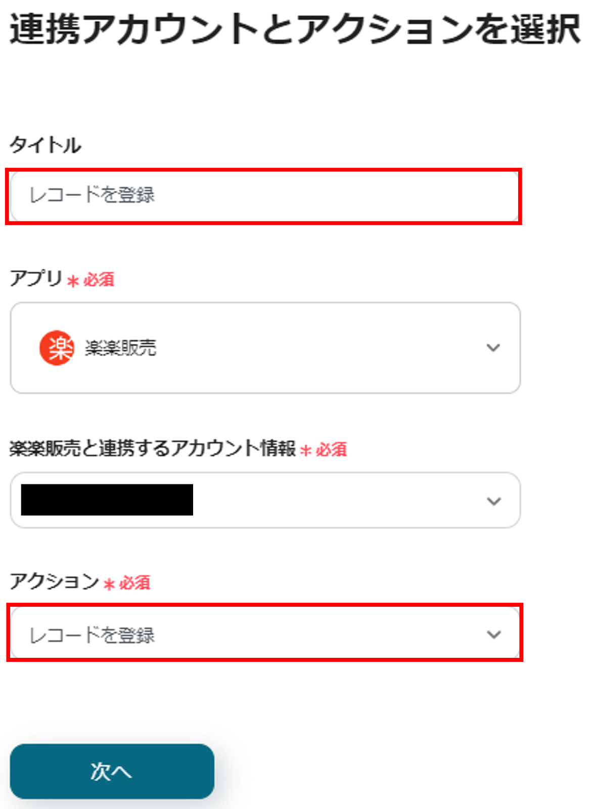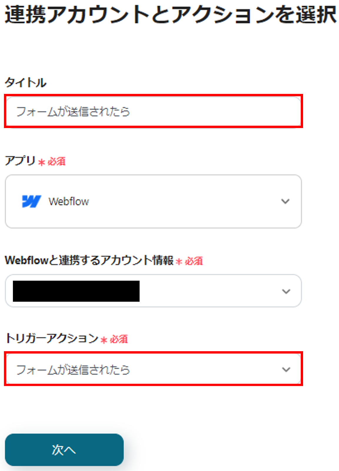 (2)タイトルを設定し、トリガーアクションに「フォームが送信されたら」が選択されていることを確認したら「次へ」をクリックします。