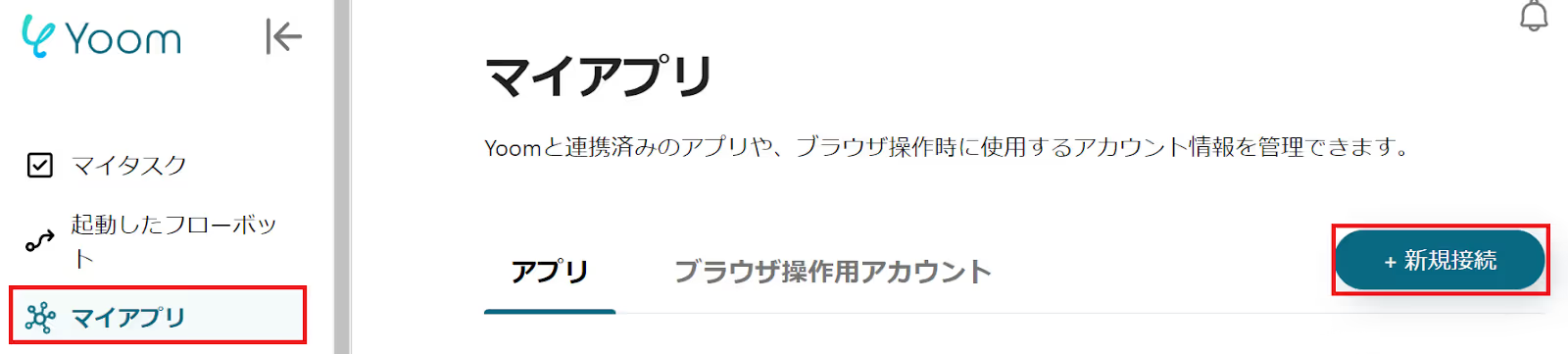 Yoom画面の左側にある「マイアプリ」→「新規接続」をクリックします。