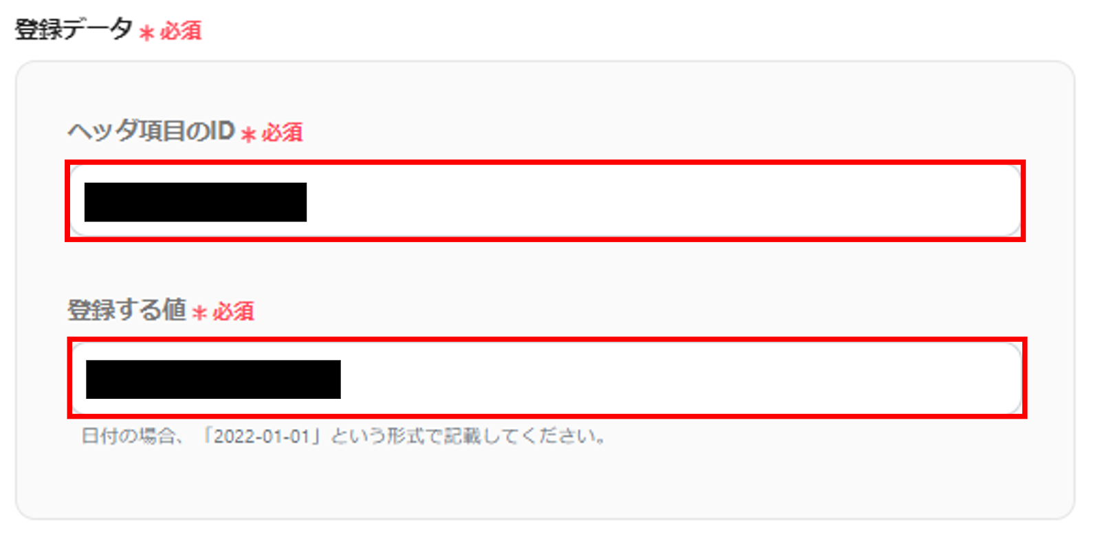 楽楽販売のアクション設定では、「ヘッダ項目ID」と「登録する値」を指定できるため、標準項目と同様にカスタム項目へも問題なく登録できます。