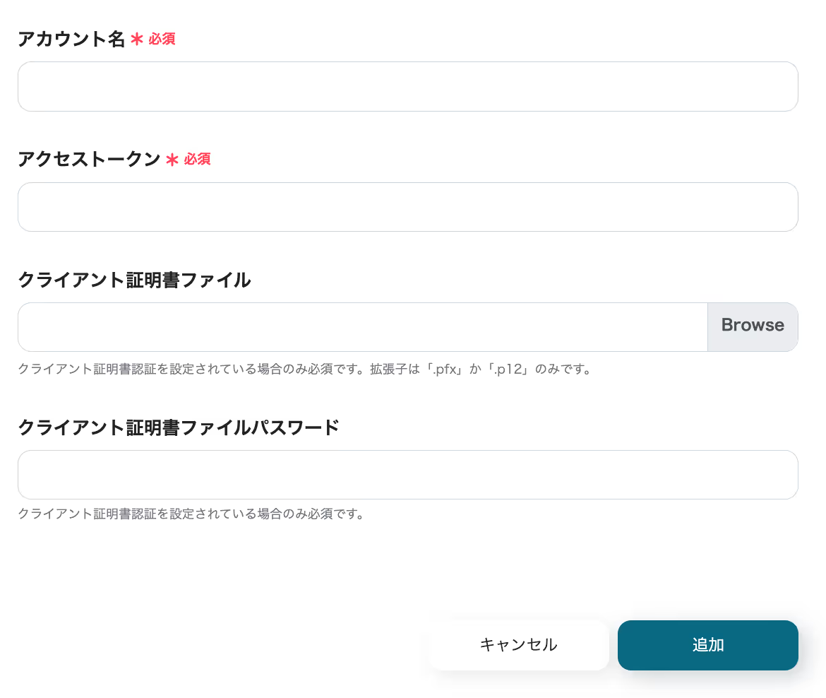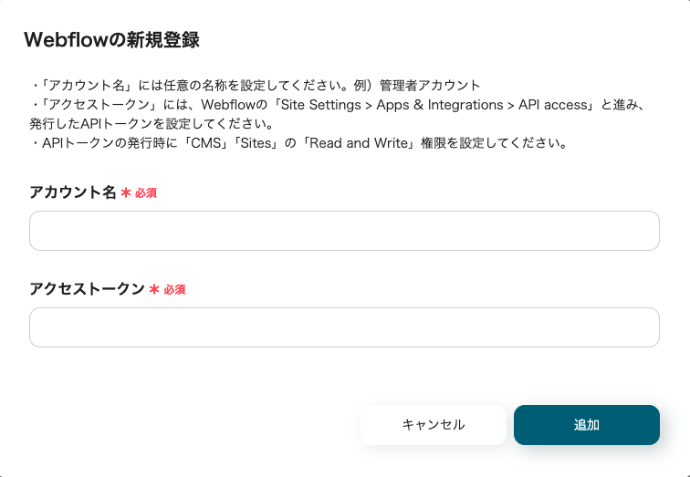 アカウント名には任意の文字列(メールアドレスなど)、アクセストークンにはWebflowで取得した値を入力し、「追加」ボタンをクリックします。