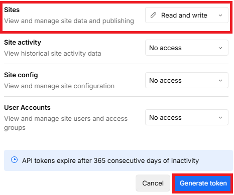 また、「CMS」「Forms」「Sites」の「Read and Write」権限を設定してください。