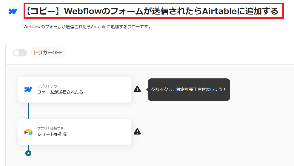 テンプレートを使って、「Webflowのフォームが送信されたらAirtableに追加する」業務フローの作成手順を紹介します。