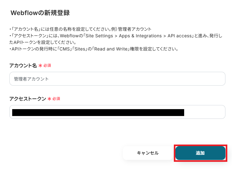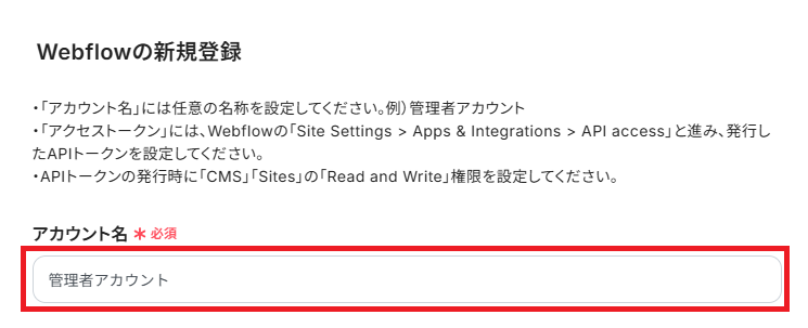 「アクセストークン」は、Webflowにログインして取得します。