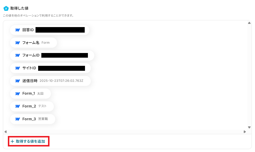 その場合は「+取得する値を追加」をクリックして情報を取得しましょう。