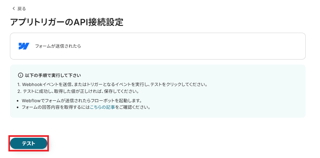 また、Webflowをトリガーに設定した場合、テストが成功してもHubSpotへ連携したいデータが表示されない場合があります。