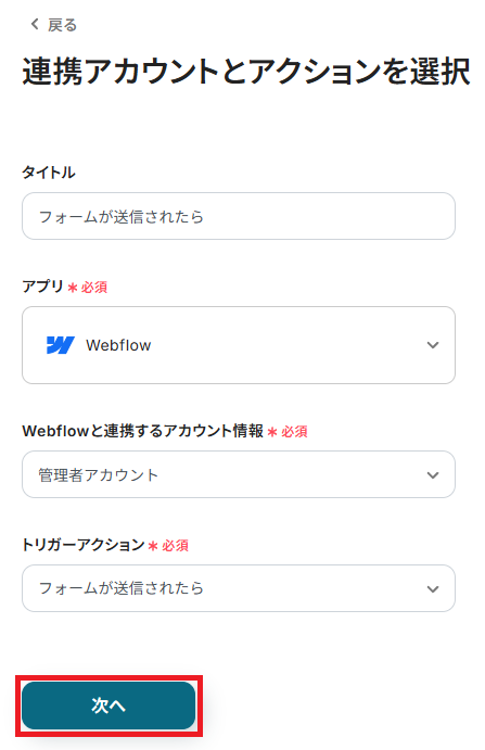 Webflowと連携するアカウントに間違いがないかを確認し、「次へ」をクリックしましょう。
