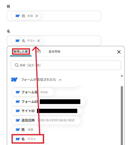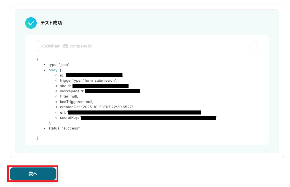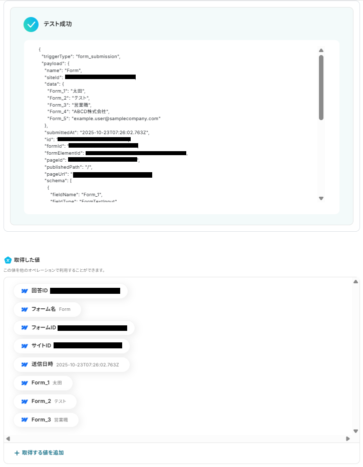 テストが成功するとテスト成功画面と取得した値が表示され、Webflowのデータが確認できます。