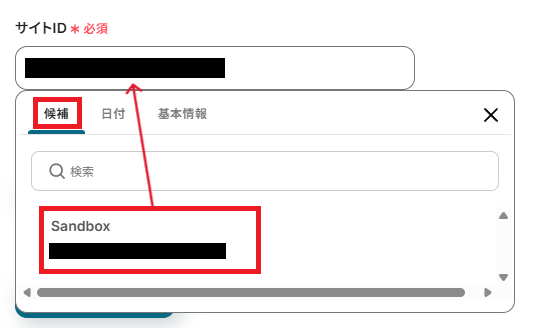 「サイトID」は、入力欄をクリックして表示される候補から選択してください。候補は、連携しているアカウントに紐づいて表示されます。