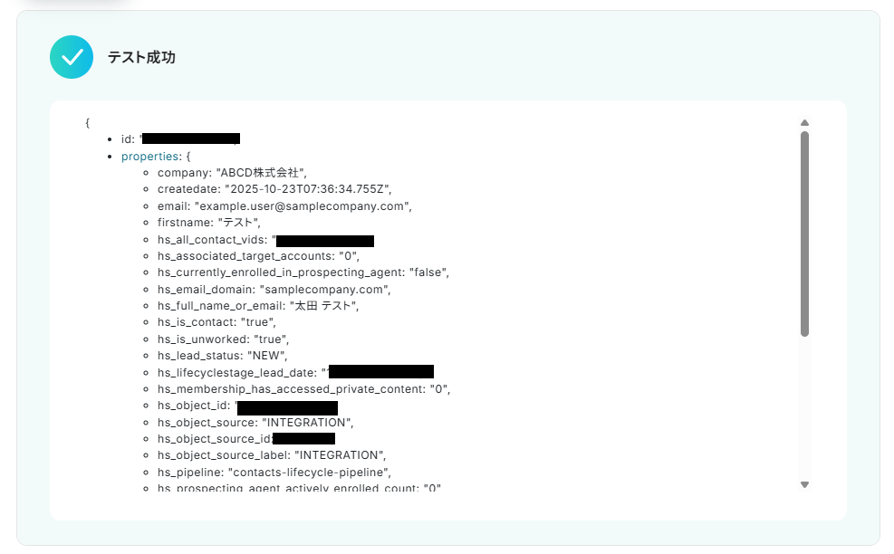 なお、ここで表示されている取得した値をそのままHubSpotへ自動登録可能です。