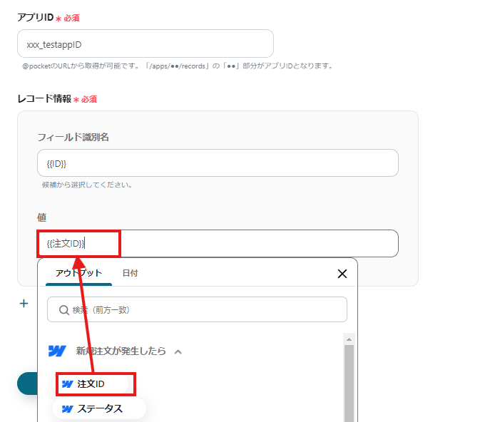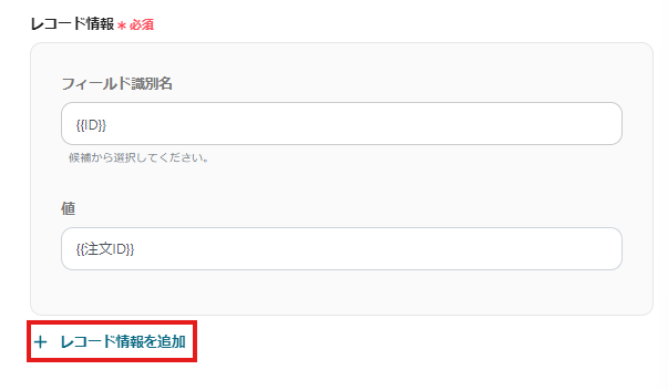 上記の画像では、注文IDを登録する設定になっていますが、他の値も登録したい場合は「+レコード情報を追加」ボタンを選択すると、新しく入力ボックスが作成されます。