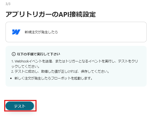 次のページではWebhookイベントを送信、またはトリガーとなるイベントを実行し、「テスト」をクリックしてください。