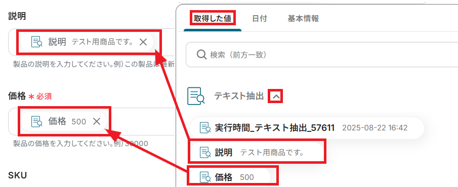 なお、テキストを直接入力した部分は固定値とされるため、アウトプットを活用せず設定を行うと毎回同じ製品データが登録されてしまうので注意が必要です。