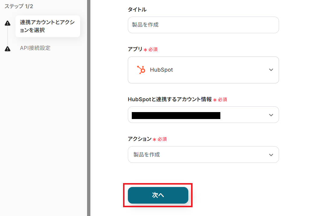 タイトルを任意で設定し、HubSpotと連携するアカウントやアクション内容を確認したら「次へ」を押してください。