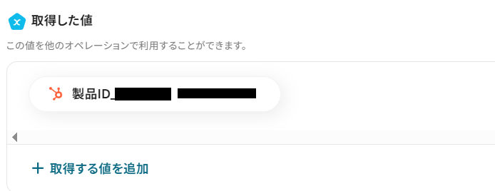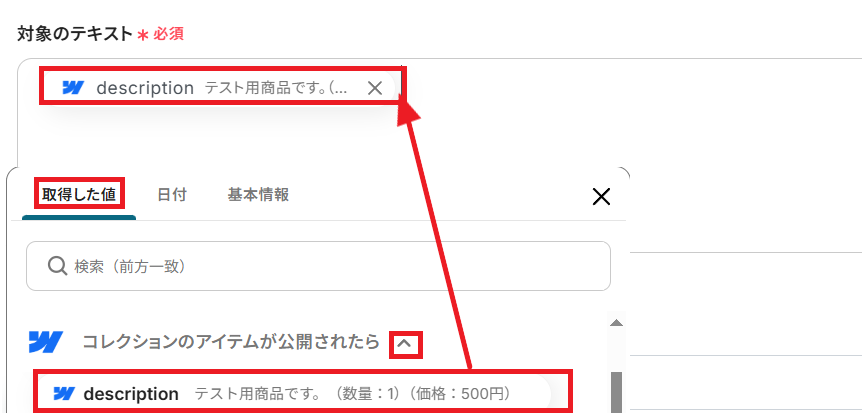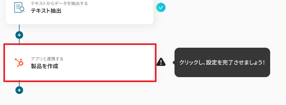 「対象のテキスト」は、HubSpotに製品として登録するための情報が記載されているテキストを取得した値から選んでください。